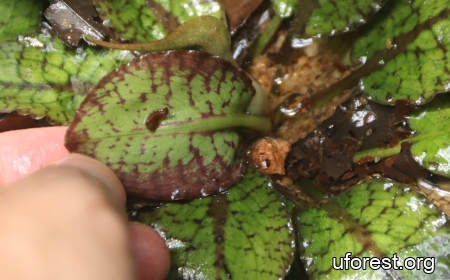 Cryptocoryne x timahensis is a special aquatic hybrid Cryptocoryne, only known in a small artificial dammed pool at Bukit Timah Nature Reserve. The leaves are narrow and oval with a rounded or heart-shaped base and a pointed tip, similar to C. cordata. Most plants also show crosswise markings on the upper surface of the leaves, a feature shared with C. nurii. For its flower, it has a spathe limb with large, uneven red bumps, a clearly visible collar, and a heart-shaped base. These features differ from C. nurii, which has a longer spathe limb with a yellow background — a trait also seen in C. cordata (Bastmeijer & Kiew, 2001).