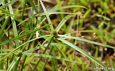 Very common in unmanaged lawns and scrublands, Kyllinga polyphylla is a upright herb with the distinctive leafy bracts surrounding the inflorescence spike at the tip as with all Kyllinga species.