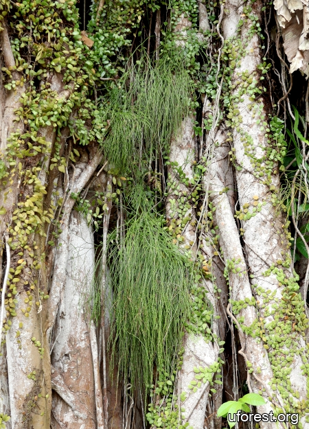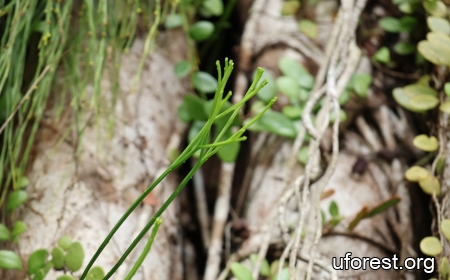 Psilotum nudum is a unique fern with no obvious leaves. It grows in clumps usually as an epiphyte on trees and can be identified easily from its string like stems that branches dichotimously.