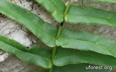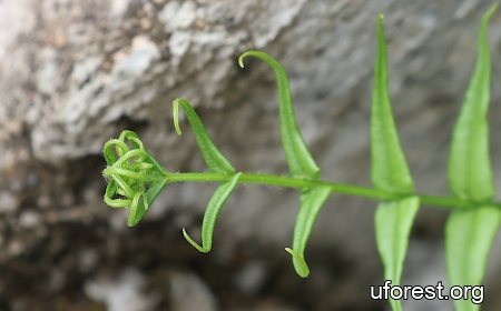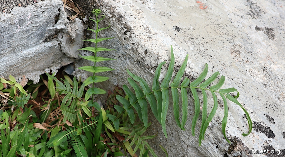 A common fern that can be found growing from drains, buildings and off other concrete cracks. The fronds are pinnately compounded, with simple leaflets which are arranged alternately or subopposite. Each leaflet is elongated but usually wider and cordate at the base.