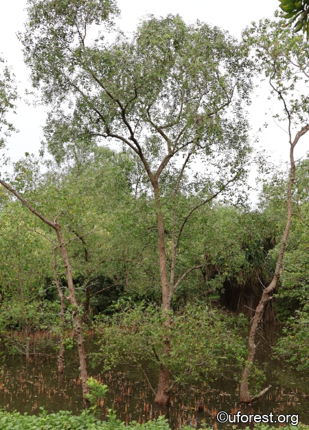 A true mangrove species that can be easily distinguished from others from its opposite and elliptic leaves, and large conical peumatophores. The branches have a characteristic droop. The flowers have many stamens, being pink at the base and white at the tips.