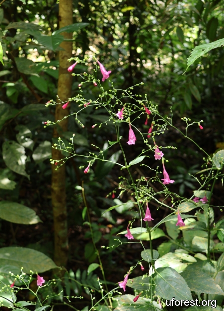 A short erect herb of less than 2m. The leaves are ovate or elliptic, with serrated margins and raised veins. The inflorescence is a panicle, and the individual pink flowers are trumpet-shaped.