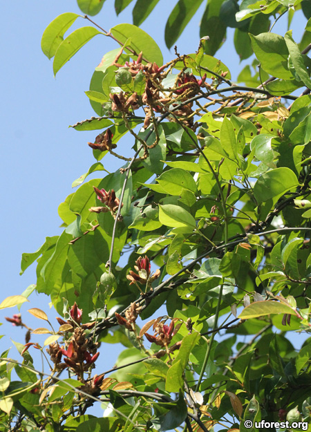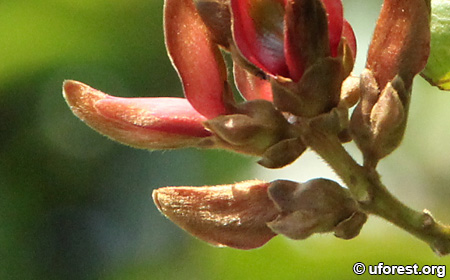 Callerya eriantha is a woody climber, found in our nature reserves. It has compound leaves that are opposite pinnate of 2-3 pairs, with a terminal leaflet. Each leaflet have a distinct drip-tip. The coppery red flowers are covered with golden hairs. The fruit pods are 1-seeded.