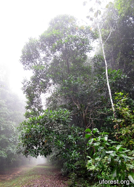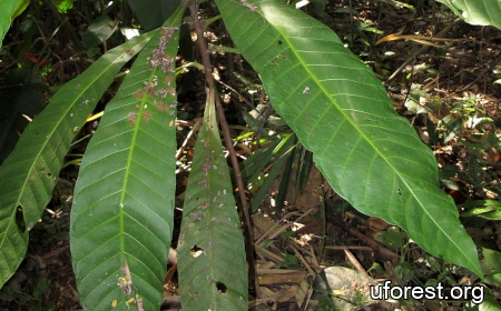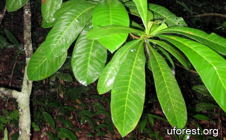 A tree of 30m, usually found in swamp forests or streams. The leaves are arranged spirally, clustered at the ends of branches and are pointed upwards. It looks like Campnosperma auriculatum in form, but with smaller leaves. The main difference between the two is the lack of the two small leafy "ear lobes" extending out at the tip of the petiole in C. squamatum, though its petiole is winged and broadens at the tip.