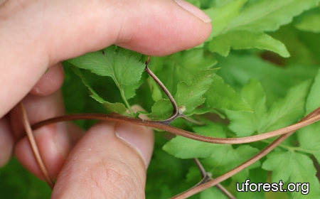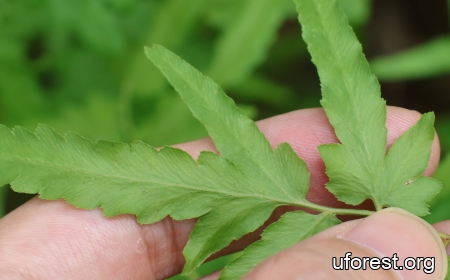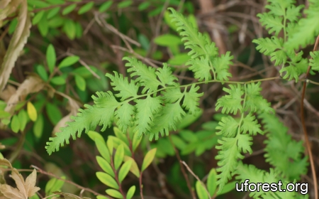A naturalised Lygodium that can be found in urban areas. The fronds are branched in pairs. Each mature, sterile leaflet is lanced-shaped, with the base having varying degrees of lobes. The margins are serrated.